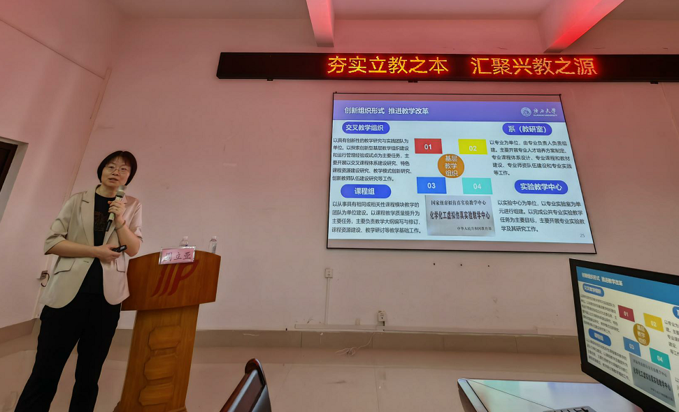 周立亚从“金专”“金课”“金师”三个方面讲授。指出专业是人才培养的基本单元,课程是人才培养的核心要素,教师是人才培养的决定因素。并着重从“金师”的条件——政治素质强、业务能力精、育人水平高三方面进行了理论联系实际的阐述。同时,结合自己丰富的教学经验,以化学类专业课程为例,分享了挖掘思政元素、开展课程思政、全方位育人的做法和成果。