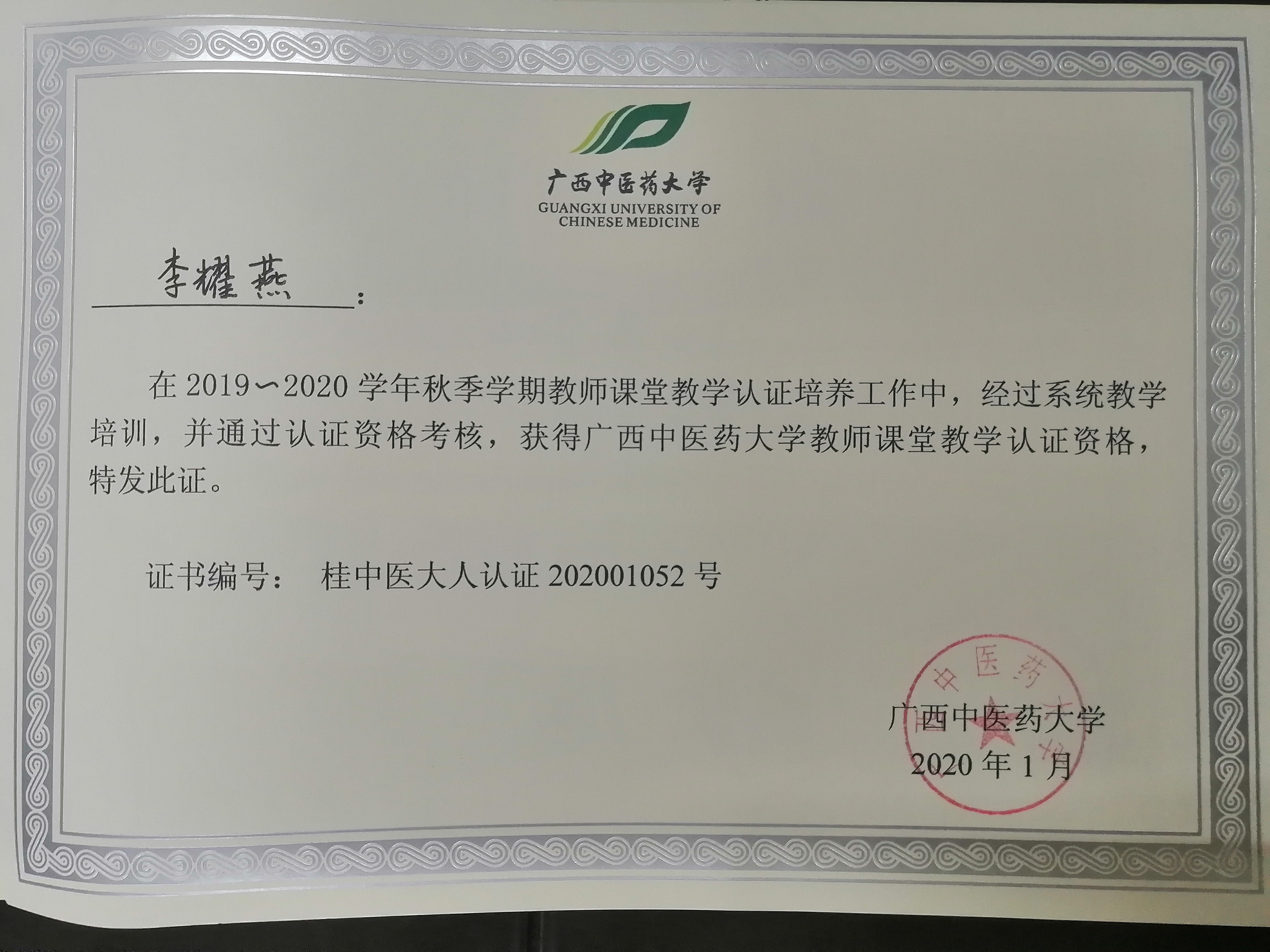 教研室专任教师师资培养 发布时间:2023-05-08 10:09:35 浏览次数: 次 【字体:小 大】 教研室年度师资培养计划-基础教研室.doc李耀燕--广西中医药壮瑶医药健康养生保健人才培训班.jpg李耀燕教师资格认证证书.jpg 分享到: 【打印正文】
