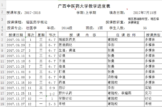 2017-2018年上学期瑶医药概论教学进度表 发布时间:2017-11-17 15:48:38 浏览次数: 次 【字体:小 大】 2017-2018年上学期瑶医药概论教学进度表 分享到: 【打印正文】