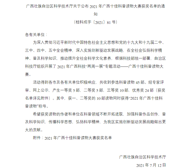 为深入实施创新驱动发展战略,在全社会弘扬科学精神、普及科学知识,推动提升全社会科学文化素养,根据科技部统一部署,自治区科技厅组织开展了2021年广西科技“两周一展”专题活动——广西十佳科普读物大赛。经专家评审、网上公示,产生一等奖5部,二等奖5部,三等奖10部,优秀奖24部。beat365正版唯一入口必一获得2021年广西十佳科普读物大赛奖项2项,其中瑶医药学院冯秋瑜老师主编的《壮瑶族养生药膳本草》荣获一等奖。