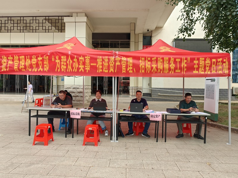 10月26日上午,在支部书记钟勇的带领下,全体支部党员到仙葫校区五和食堂前广场开展了“为群众办实事--推进资产管理、招标采购服务工作”主题党日活动。