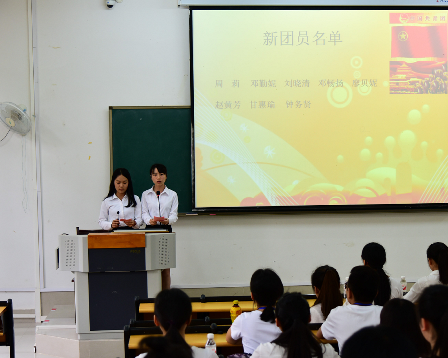 在仪式中,广大新老团员共同奏唱中华人民共和国国歌以及共青团团歌,并由老团员为新团员佩戴团