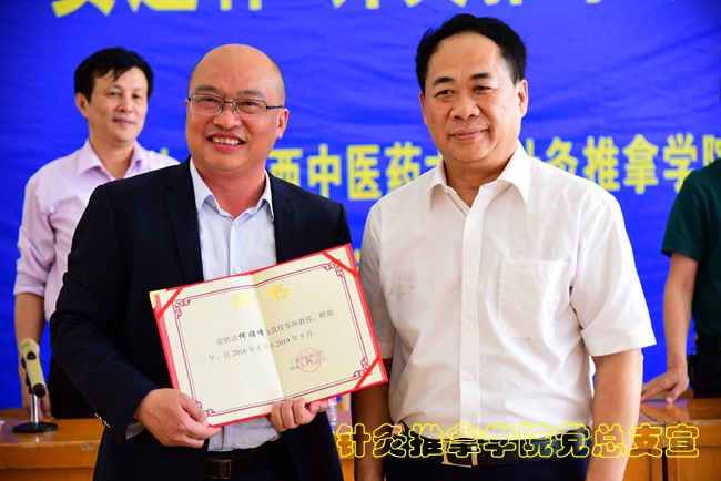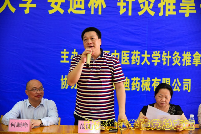 在开幕式上,董塔健、罗伟生、何顺峰分别作了讲话,罗伟生代表学校向何顺峰先生颁发了beat365正版唯一入口必一客座教授的证书,何顺峰先生向荣获2017“安迪自强奖学金”的同学颁发了奖学金。针灸推拿学院党总支书记蒋闽义主持了开幕式。