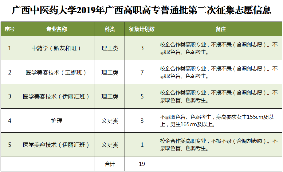2019年征集志愿-广西高职高专普通批第二次 发布时间:2019-08-13 11:23:49 浏览次数: 次 【字体:小 大】 beat365官网本次将征集中药学(新友和班)等专业计划共19名,详情如下: 征集志愿填报时间:8月13日下午18:30至14日上午9:00,请考生在规定时间内到广西招生考试院官网(http://www.gxeea.cn)进入“2019年普通高等学校招生志愿填报”填报征集志愿,并在录取期间保持报名时所留联系电话畅通。 详情请点击“征集志愿”。 分享到: 【打印正文】