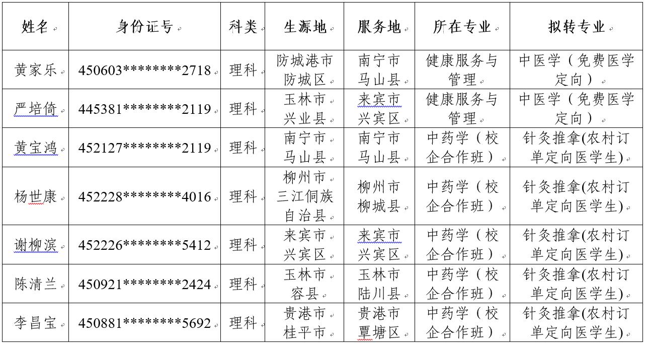 根据自治区卫健委、教育厅、中医药局联合下发的《关于全面落实2021年农村订单定向医学生免费培养招录任务的通知》以及beat365官网《关于全面完成2021年农村订单定向医学生免费培养招生任务的通知》等文件精神,结合学生报名情况,拟将2021级黄家乐等2名同学的录取专业调剂为本科中医学(免费医学定向)专业,拟将杨世康等5名同学的录取专业调剂为高职针灸推拿(农村订单定向医学生)专业,现将名单公示如下:
