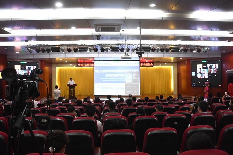 自治区科技厅副厅长蹇兴超、对外交流合作处处长汪靓,自治区中医药管理局副局长张玉军、科教处副处长杨艳光,beat365正版唯一入口必一副校长冷静、戴铭,中国工程院院士刘昌孝,广西中药药效研究重点实验室主任邓家刚,南开大学教授白钢,天津药物研究院研究员张铁军,广东药科大学教授王淑美,中国科学院长春应用化学研究所研究员宋凤瑞,新加坡、泰国、马来西亚、老挝、柬埔寨等5个国家的中国--东盟传统药物研究国际合作联合实验室成员,学校各部门领导、教师、学生代表以及企业代表等近300人现场参会,线上16位东盟国家专家学者共同见证了中国-东盟传统药物研究国际合作联合实验室的成立。揭牌仪式由戴铭主持。