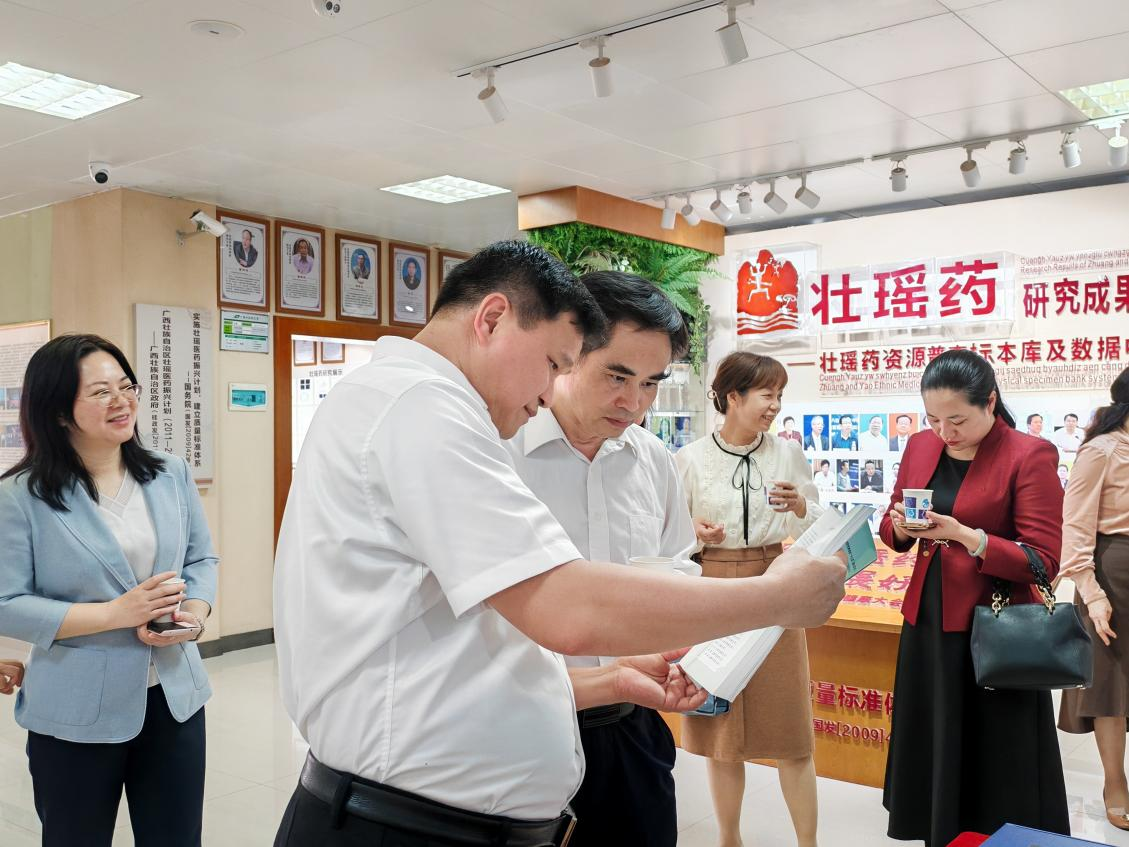 3月27日,广西卫生职业技术学院党委书记牙韩高及纪委书记傅鹏博士教授一行到本平台考察交流。本平台谢凤凤博士等师生向牙书记一行介绍了本平台《中国壮药图鉴》、《壮瑶药季刊》等理论成果和实践成果,他们品尝了实验室产品葛花露、参观了中药资源普查标本室和壮瑶药资源数据库,试用了平台研制的兰香草精油。牙书记对平台发展表示高度赞赏,并鼓励青年研究人员花更多的时间精力投身科研工作,为壮瑶药高质量发展贡献力量。