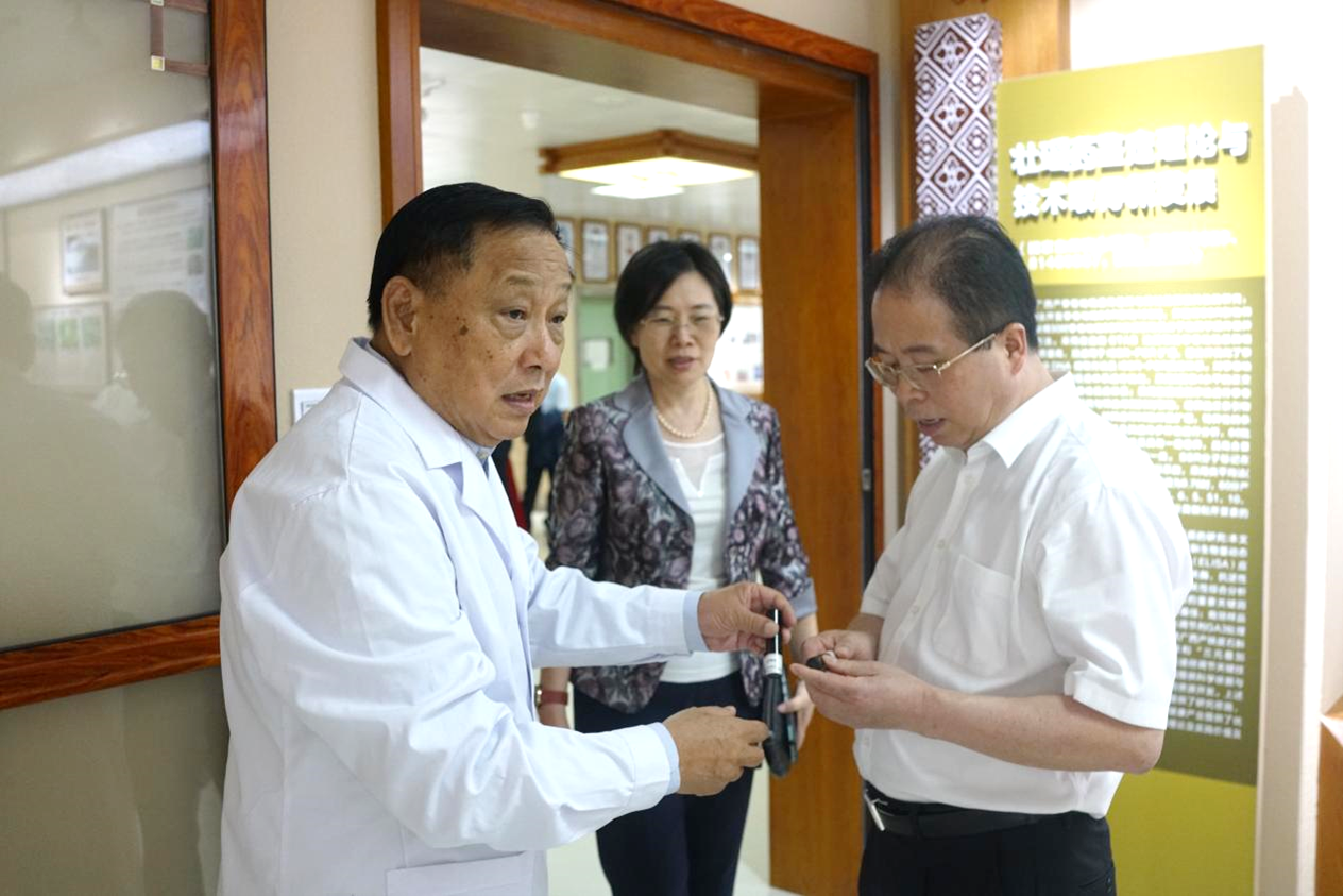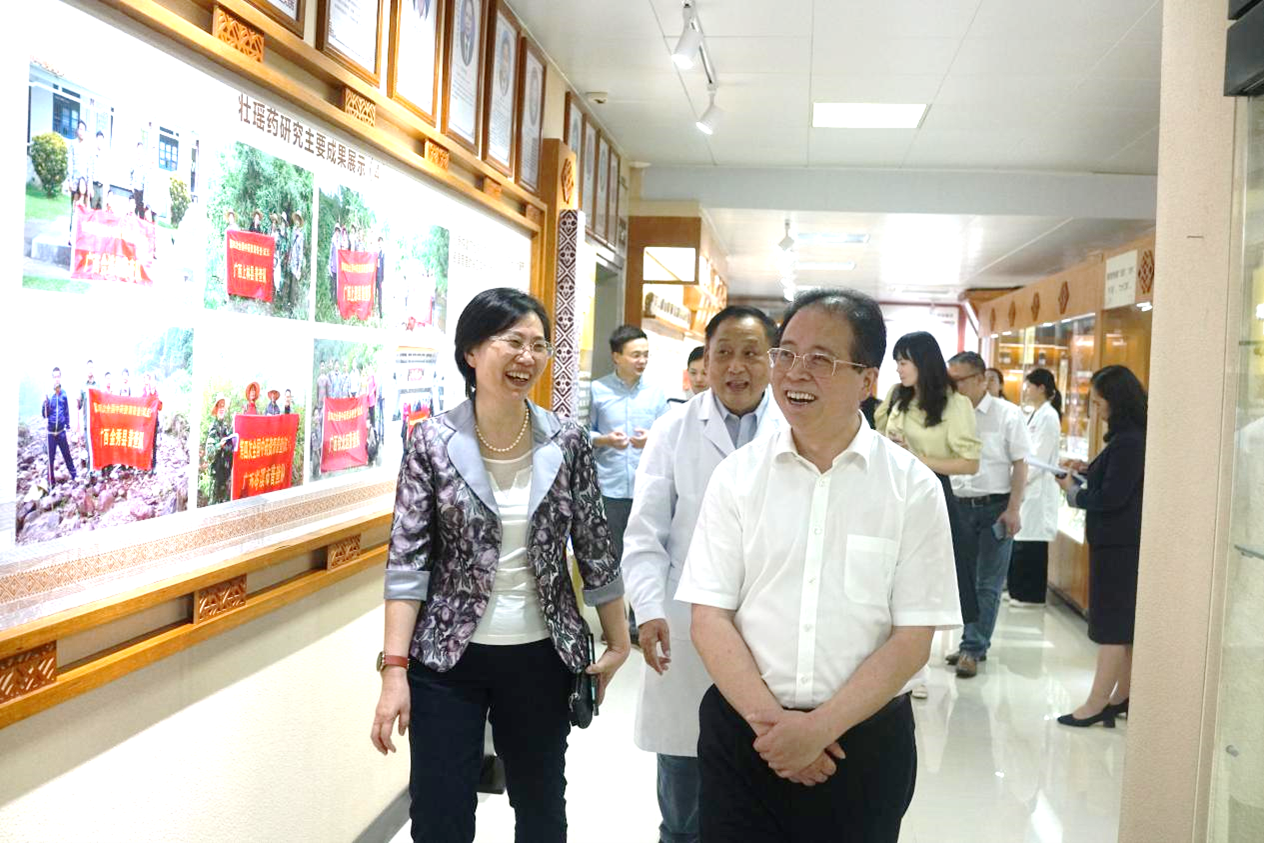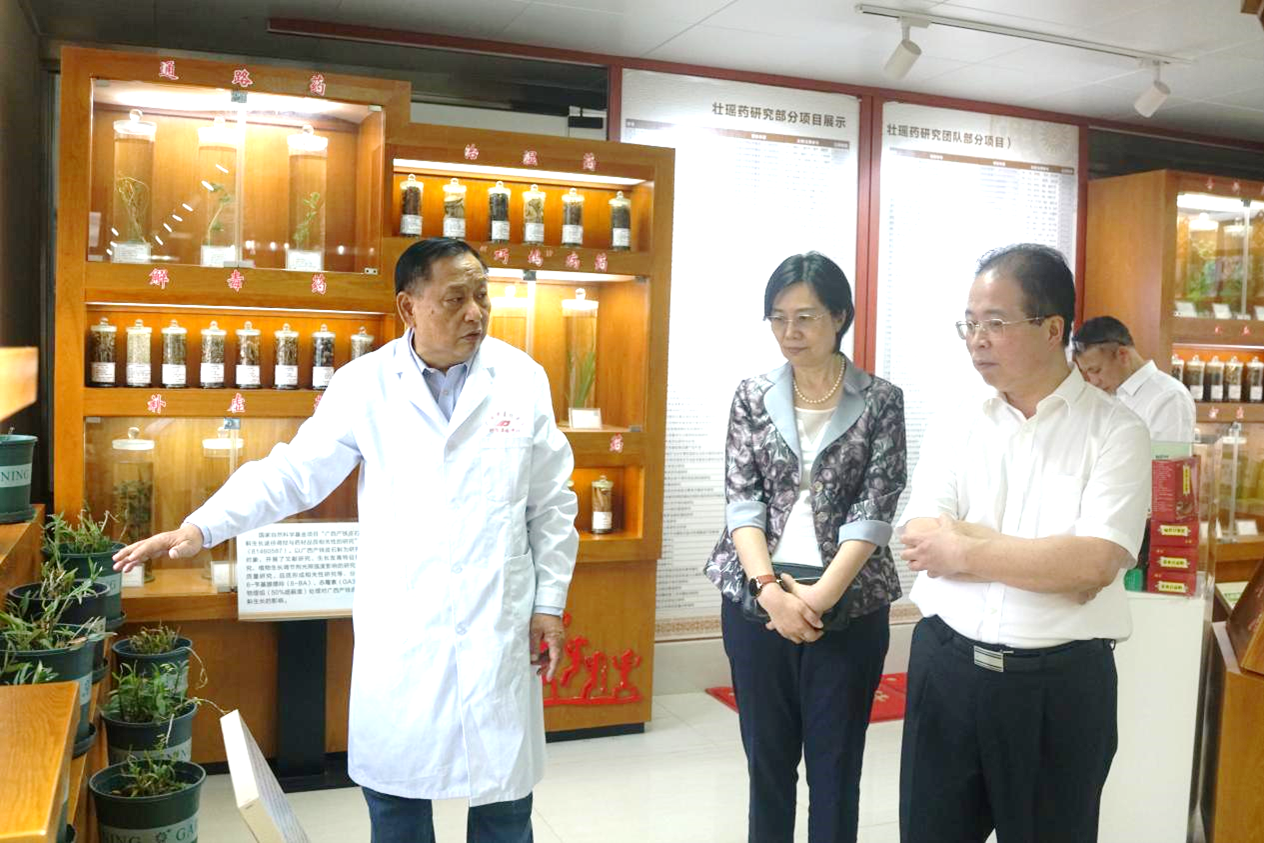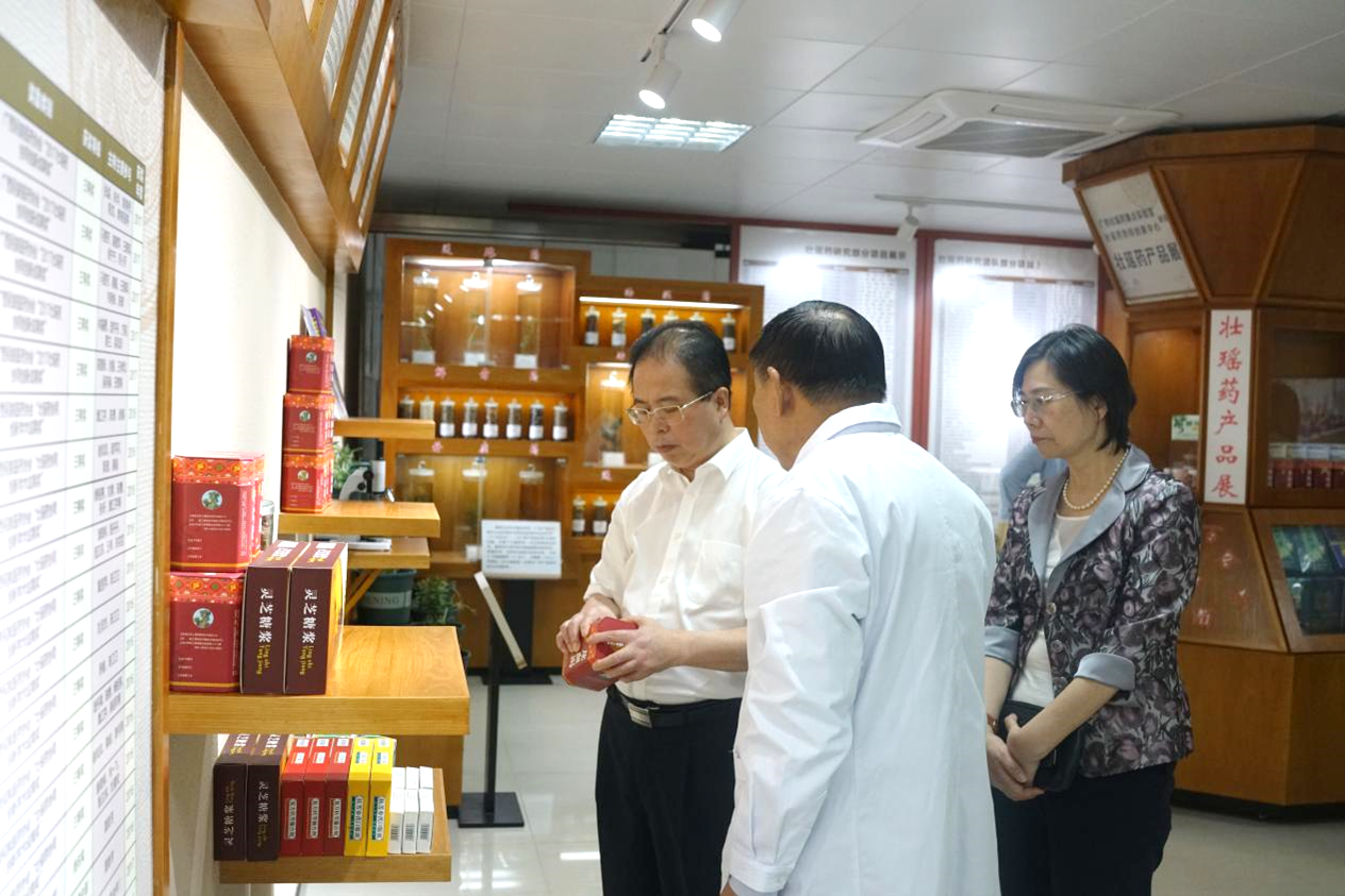 刘中秋一行还实地考察了壮瑶药重点实验室,在副校长冷静、实验室主任朱华的带领下,参观了壮瑶药实验室的展厅。参观期间,朱华简要介绍了壮瑶药重点实验室的基本情况,并且向刘中秋一行展示了壮瑶药理论和实践研究成果、平台获得的科技奖项、中药资源普查标本库以及实验室产品兰香草精油等。刘中秋对平台成果给予高度评价,同时对民族药的研究以及学科建设提出了宝贵意见。