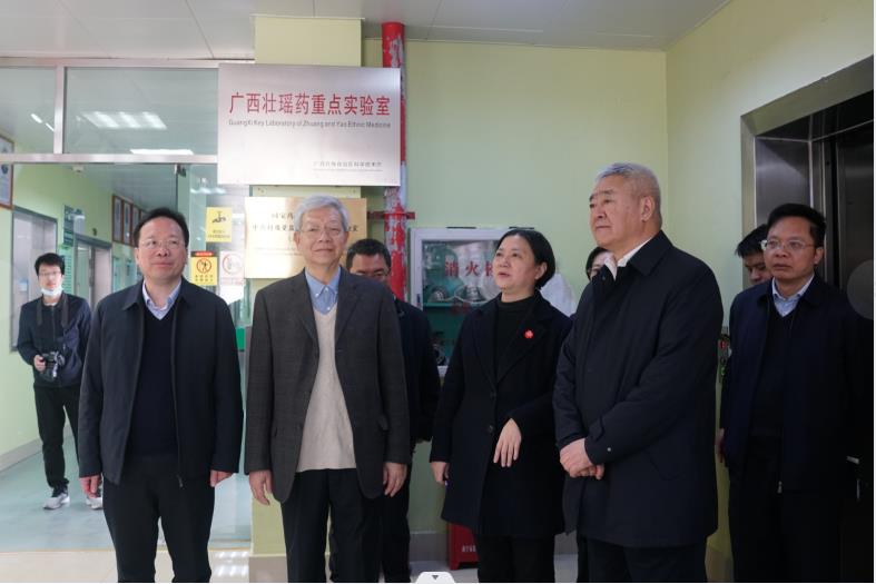会后,院士一行实地考察了我平台,了解我平台中药壮瑶药科技创新工作,学校党委书记莫锦荣、校长姚春、副校长冷静、总会计师何刚亮陪同考察交流,本平台常务副主任苏健博士、张淼老师、谢凤凤老师、许立拔老师、蒋开雨老师、韦露玲老师、余秀琪助理和刘祖锭助理以及本平台研究生参会。苏健博士汇报了我平台在产学研等方面取得的成绩,希望院士多指导,进一步指导中药材壮瑶药开发、人才培养、产业发展、科学研究、临床实践等各方面研究工作,共同推动中药壮瑶药事业与产业高质量发展。杨玉良院士和董尔丹院士在本平台考察时表示,beat365正版唯一入口必一壮瑶药研究平台很有特色,很有发展前景,希望进一步结合区域特色,推动壮瑶药高质量发展。