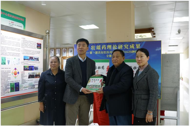 莫雪妮处长、卢汝梅院长、朱华教授结合广西中药壮瑶药发展历程为路金才院长深入浅出地介绍了广西特色药材桂十味、壮瑶药的历史、特色、现状和未来,并代表壮瑶药研究平台赠予壮瑶药理论研究成果、本平台朱华、戴忠华主编的《中国壮药图鉴》,该著作是第一部具有壮医功效与主治1628种壮药图鉴,该著作获第二十六届中国西部地区优秀科技图书一等奖。