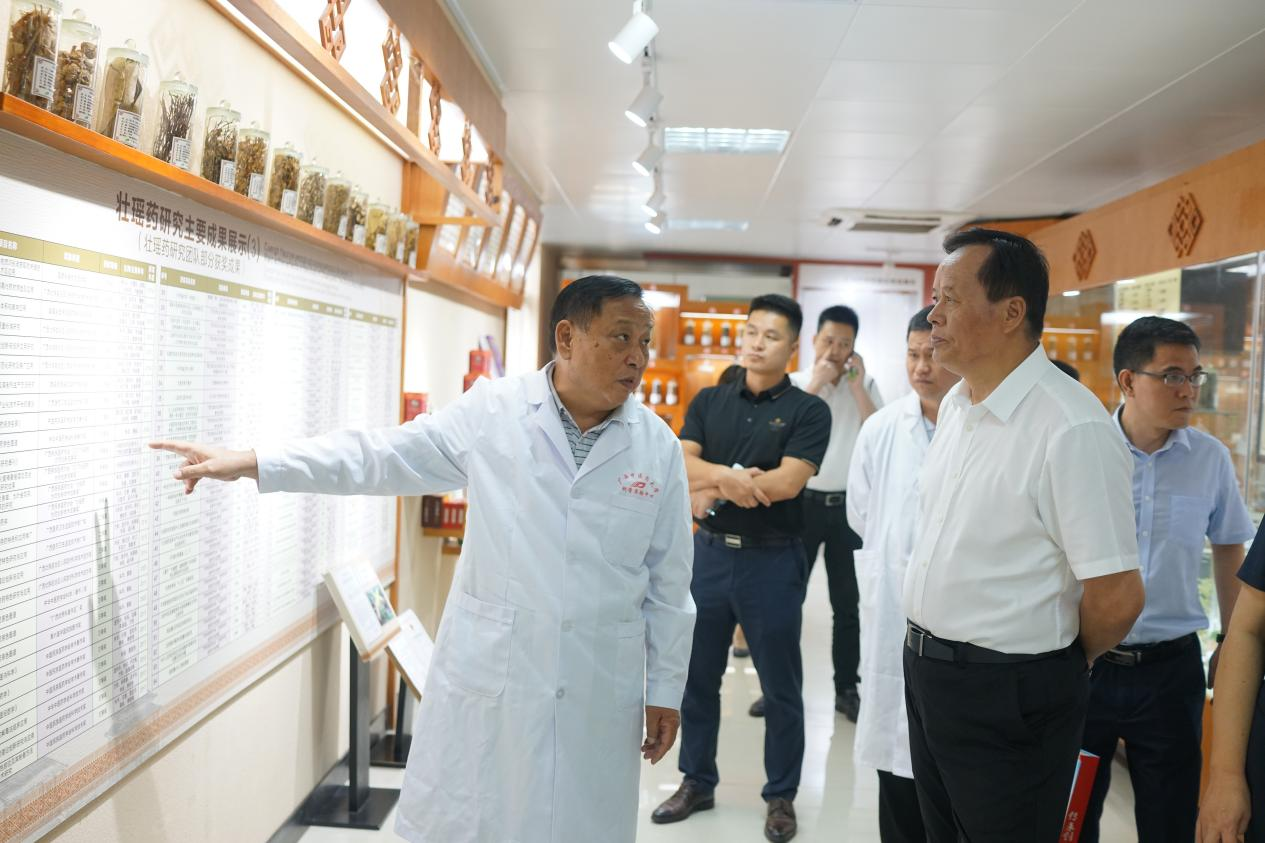 图1 朱华教授为仝小林院士介绍壮瑶药研究主要成果