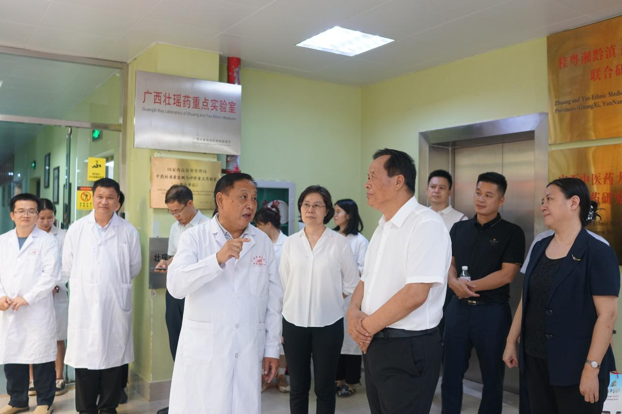 平台主任朱华教授,向仝小林院士汇报了壮瑶药实验室建设情况,与中南大学合作组建壮瑶药研究联合实验室、建设成为国家药品监督管理局中药材质量监测与评价重点实验室(联合单位),在理论、资源、标准、产品及人才培养方面成果丰硕,在壮瑶药专项研究方面达到领先水平。仝小林院士对我实验室建设取得的成果给予了高度肯定并现场题词:“壮瑶医药,大放异彩”。