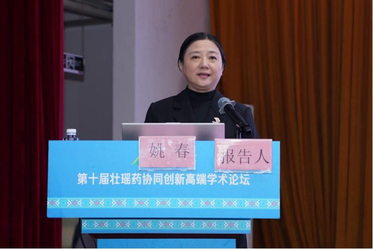 朱华教授做《中国传统药物(壮药)质量标准研究与应用》学术报告,展示了壮瑶药理论传承与创新方面的研究成果,并构建了“品种-质量-药效-应用”四位一体的关键技术体系,为壮瑶药的振兴与发展奠定了坚实的理论与技术基础。