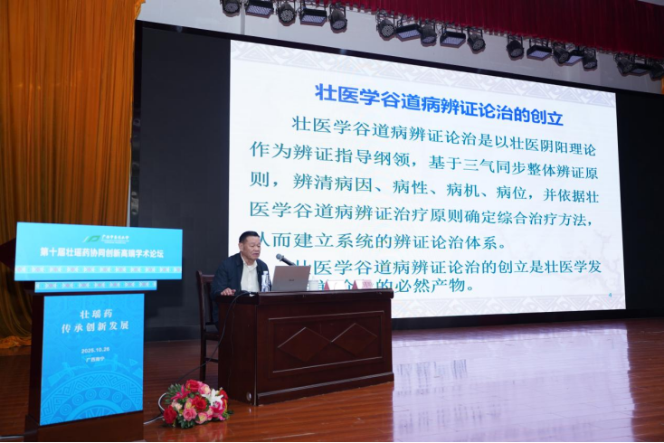国医大师黄瑾明教授做题为《壮医学谷道病辨证论治》学术报告,王孝勋博士研究员主持。黄瑾明教授系统阐述了壮医学进入新发展阶段的重要标志——壮医学谷道病辨证论治体系的建立。内容以壮医阴阳理论为纲领,结合三气同步、毒虚致病、气血均衡等理论,构建了一套完整的谷道病辨证论治体系,涵盖病因病机、病位辨证、基本证型、五大治疗原则及基本方剂,并介绍了壮医天阴阳针法、灸法等特色外治法。