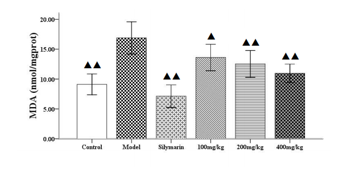 | 水飞蓟宾组 | 44 | 10 | 58.12±6.37▲▲ | 73.85±14.79▲▲ |