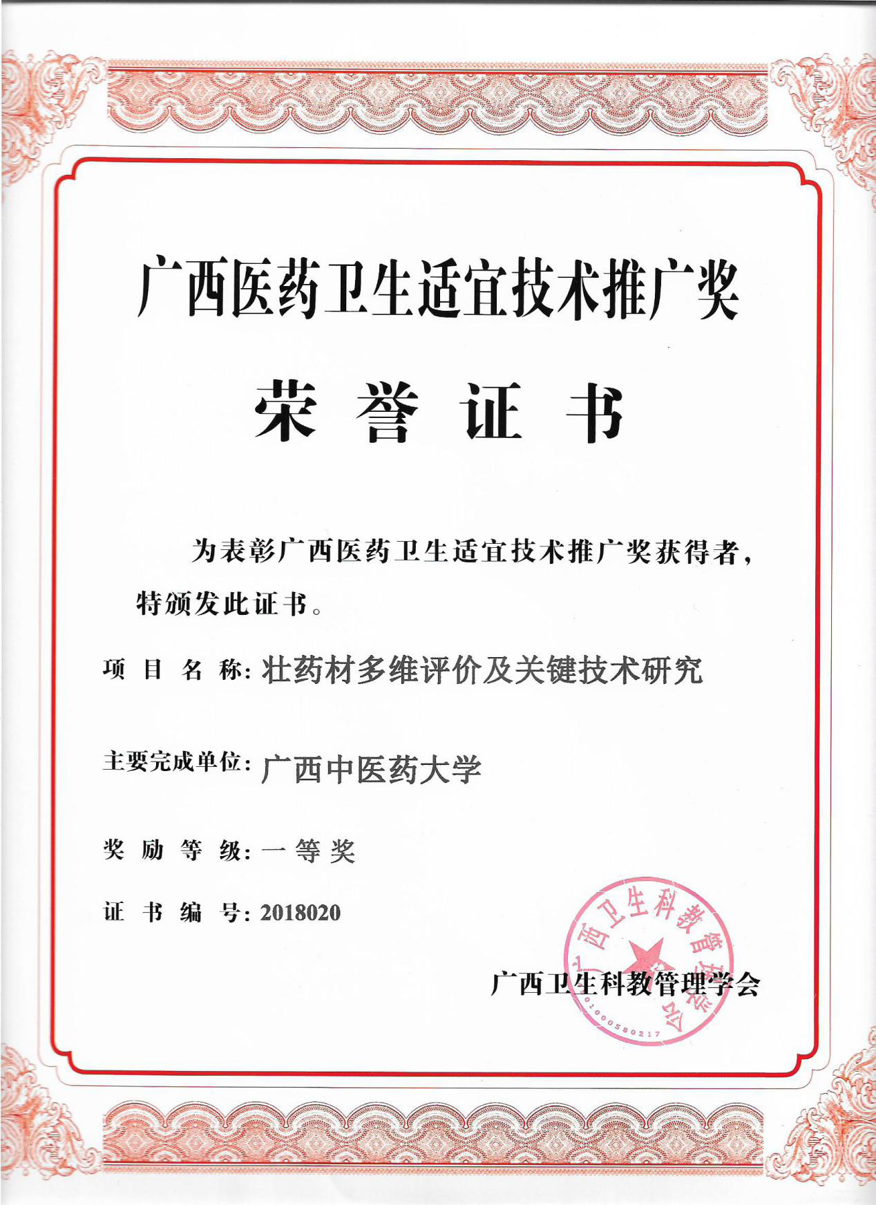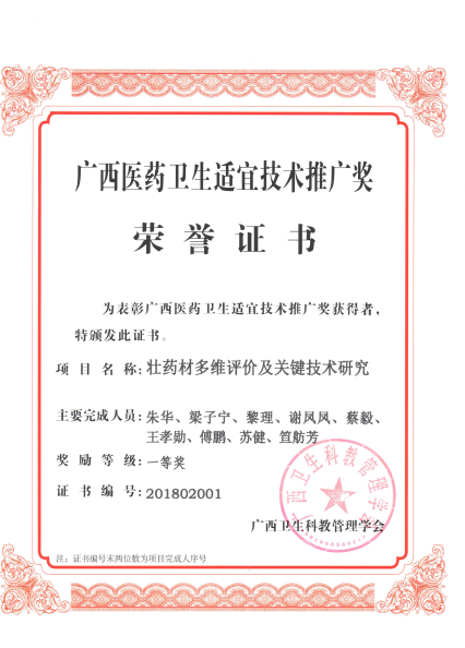 2018年度广西医药卫生适宜技术推广奖公布了评审结果,我团队科研成果《壮药材多维评价及关键技术研究》喜获一等奖,获奖人员名单:朱华、梁子宁、黎理、谢凤凤、蔡毅、王孝勋、傅鹏、苏健、笪舫芳、张淼、陈龙、滕建北、周雨晴、杜沛霖、龙莉。这是我团队继2017年度荣获一等奖后又一佳绩,在beat365官网作为科研团队率先连续2年(2017、2018年)荣获广西医药卫生适宜技术推广奖一等奖,为推动壮瑶医药振兴作出了新贡献。