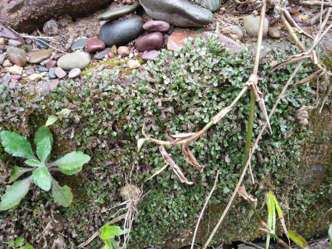c.长在山脚下溪涧边带土石头上的拳卷地钱