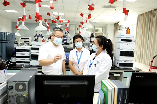 黄琛先来到广西食药检所中药民族药标本馆,听取重点实验室主任、广西食药检所党委书记张涛,所长赵庄的情况汇报,了解重点实验室在质量标准、质量监测等方面开展的研究工作。随后他来到重点实验室的主要责任科室——中药民族药室的质谱室、液相室,与技术人员当面交流,仔细询问重点实验室开展中国-东盟大宗药材、广西特色民族药检验检测情况。他强调,重点实验室的获准认定,这是一个良好的开头,更是提升全所新高度定位的良好机遇,希望实验室团队能够以此为新的起点,不负重托、不辱使命。要充分认识建设好重点实验室的意义,加强交流合作,凝聚智慧力量,勇于在重点实验室建设上开创出一条奋勇争先之路。要着力聚焦我区中药民族药特色优势产业,提高创新发展支撑能力,勇于在我区生物医药产业规模化发展上开创出一条特色之路。要打通“产—学—研—用”链条,推进新旧动能转换,全力提升中药材科学化、标准化、国际化水平,勇于在科技成果转化之路上开创出一条活力之路。