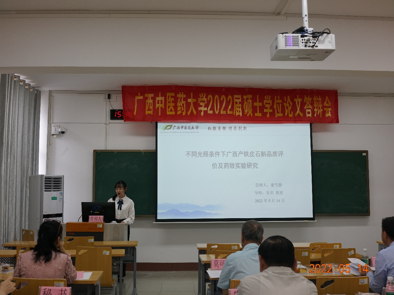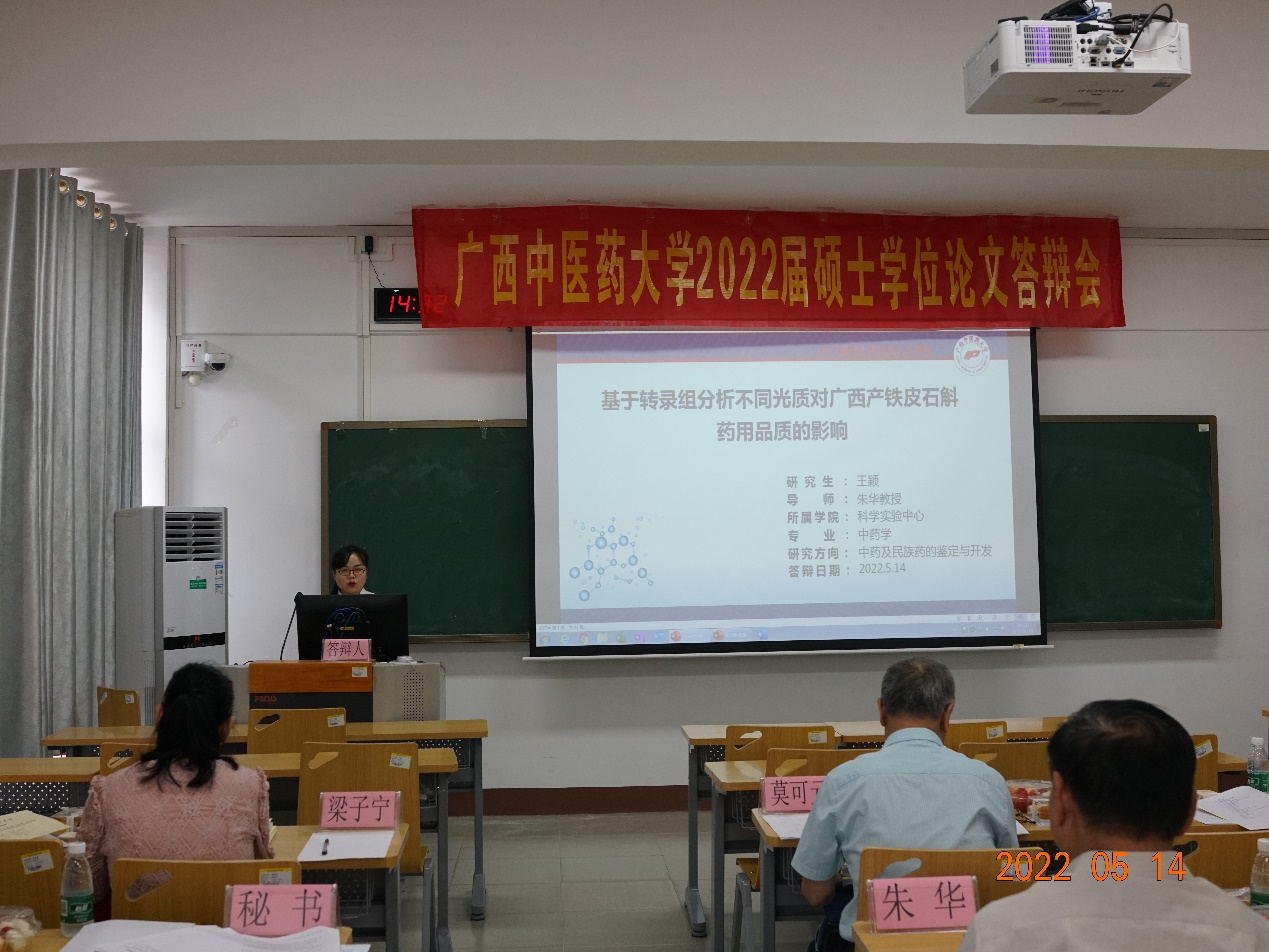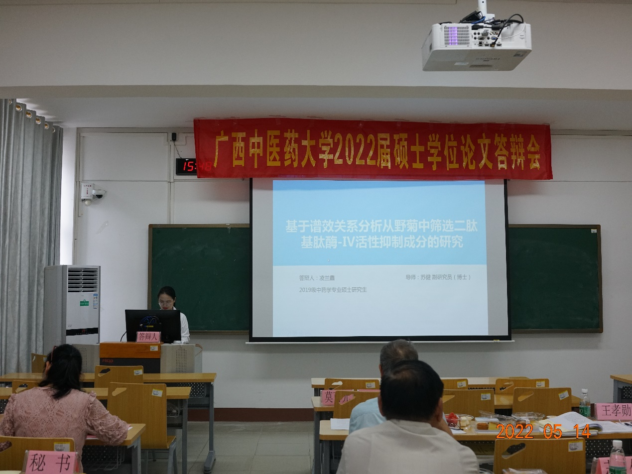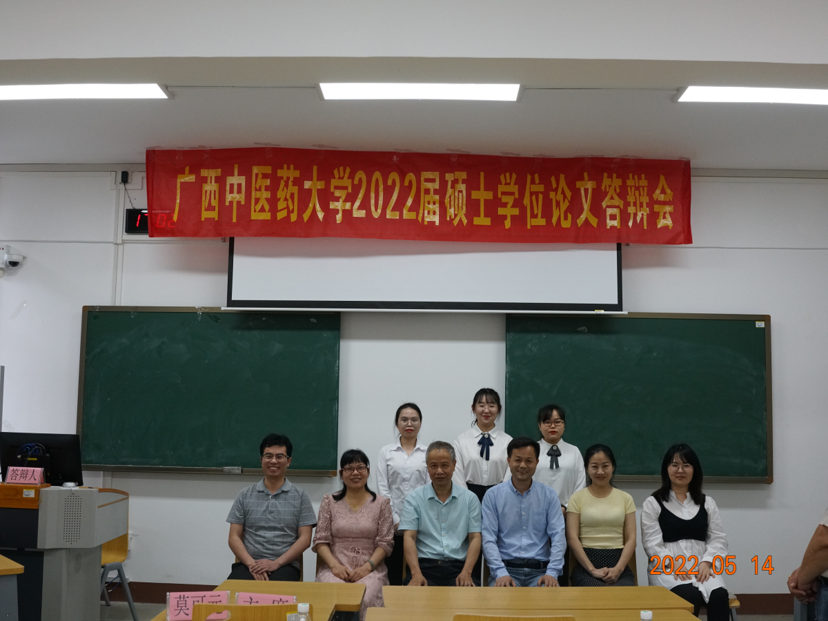 5月14日下午,平台实验室硕士研究生毕业答辩会于beat365正版唯一入口必一明秀校区时珍楼6-606教室顺利召开。本次答辩对象为2019级研究生。答辩会主席为自治区人民医院莫可元主任中药师,答辩委员会委员有beat365正版唯一入口必一梁子宁博士教授、王孝勋博士研究员、梁爽高级实验师、戴忠华博士副教授,答辩秘书张淼老师。
