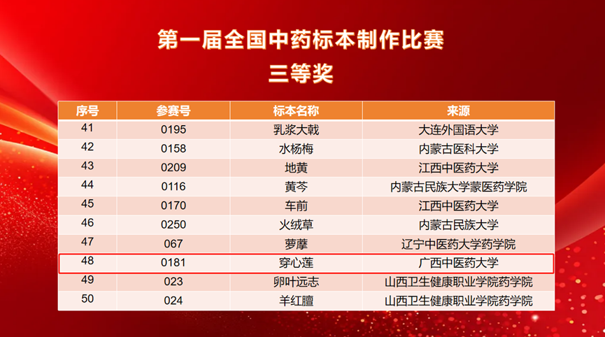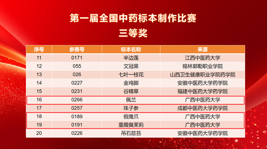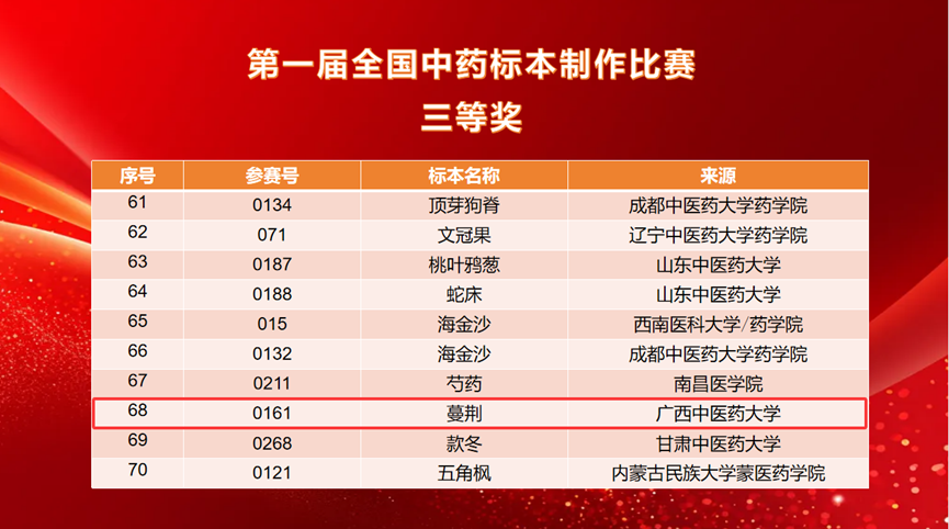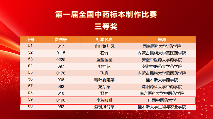 经过前期的精心准备与选拔,beat365官网壮瑶药研究平台派出3名教师带队,11名研究生参赛,共提交16件标本作品。比赛中,beat365官网壮瑶药重点实验室研究生吴文源同学(指导老师:朱华、戴忠华)制作的药用植物标本《檀香》荣获第一届全国中药标本制作比赛二等奖;研究生何丽霞、韦杰玉、陈德栋等同学制作的《假鹰爪》《重瓣臭茉莉》《穿心莲》《小粒咖啡》《蔓荆》《赪桐》《磨盘草》《佩兰》等八件药用植物标本荣获第一届全国中药标本制作比赛三等奖,充分展示了beat365官网在中药标本制作与中医药教育领域的深厚实力与学子昂扬向上的精神风貌。