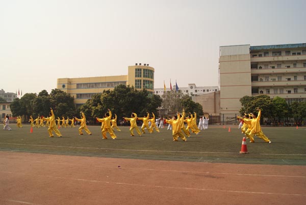 太极剑以太极阴阳之理运用于剑道,动作虽缓但潜力极强,外柔内刚正是女子应有之姿态。09壮医的女生们经过多时的练习,在场上亦有万夫莫当之势。红粉们长发挽起,双目清澈,眉间英气逼人。比赛场上她们排列整齐,舞起剑来姿势优美,典雅大方,抬手收足如行云在空,刺剑收剑如流水于海, 09壮医的女生们高水平完成了比赛,获得09级别第四名的佳绩。而08壮医女子太极剑也获得了08级别第八名的优异成绩。