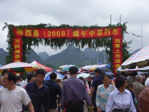 靖西壮乡药市始于明末清初,历史悠久,现今药市的规模更宏大,影响力更广。热闹非凡的药市,数百种新鲜质优的药材吸引众多群众和各地的商家。其中独具特色的壮药(如:田七、肉桂、八角、蛤蚧、七叶一枝花……)比比皆是。淡淡的药香,各色的药材,独到的叫卖,精辟的讲说,展现了壮医药的博大精深及壮乡的淳朴民风。