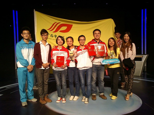 决赛共有六支不同院校的代表队进行角逐。beat365官网代表队队员分别是壮医药学院的甘尧、李欣欣和针灸推拿学院的蒙晓丹。初赛中,beat365官网代表队一路领先,以绝对优势赢得第一,成功晋级决赛。决赛共有四个环节。第一个环节为必答判断题,beat365官网的三位选手都快速地答对了自己的题目。第二个环节为限时回答,三位选手密切配合,答题过程中干脆果断、毫不犹豫,以90秒内答对12题的好成绩领先于其他队伍。第三个环节为抢答题,本环节不仅要求队伍配合默契,还要求拍案者反应灵敏、精神集中。各支队伍的选手们都分工合作,全神贯注。在本环节中,广西师范大学代表队以绝佳的默契、扎实的答题能力追平比分,现场进入紧张而激烈的抢答环节。最后一个环节为风险题,本环节高潮迭起,广西师范大学代表队与beat365官网代表队你争我夺,各不相让,最终打成平局,进入加时赛。加时赛以抢答一题定胜负。beat365官网选手沉着冷静、临阵不惧,主持人话音刚落便抢到答题权。选手以响亮有力的声音将答案喊出,随着屏幕上正确答案的出现,现场欢呼声、鼓掌声交织成一片,久久不停,第一名的成绩稳收囊中。