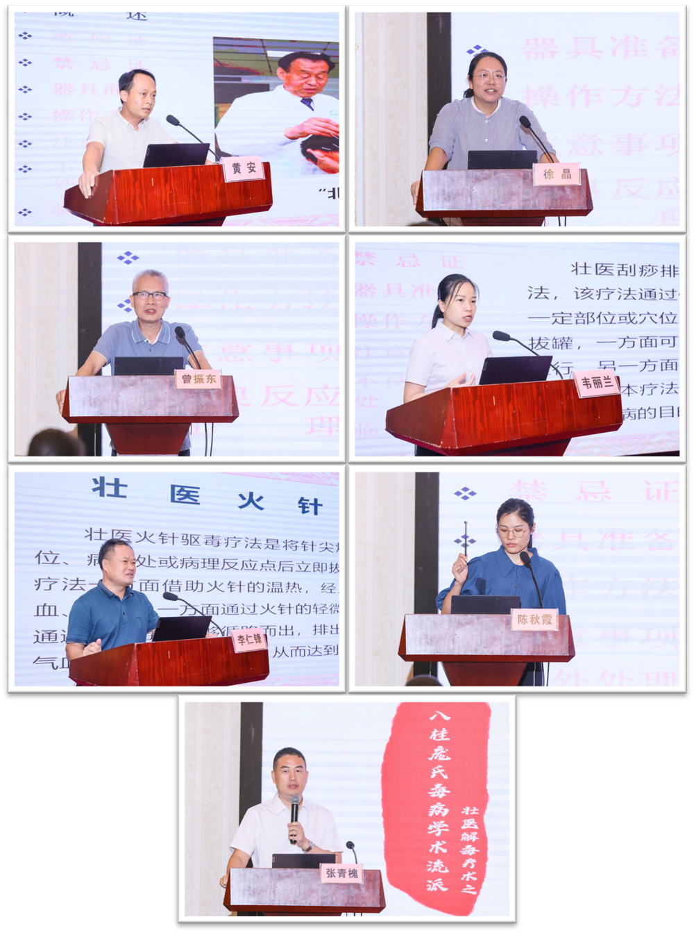 特色解毒技法培训专题环节,曾振东、李仁锋、张青槐、韦丽兰等七位专家,通过现场讲解与演示相结合的方式,分别展示了壮医热敏探穴针刺逐毒疗法、壮医药线点灸清毒疗法、壮医药物竹罐拔毒疗法、壮医刮痧排毒疗法、壮医火针驱毒疗法、壮医皮肤针祛毒疗法、壮医刺血泄毒疗法等壮医解毒七疗术的理论与实操。为与会者提供了可学可用的临床治疗新手段。