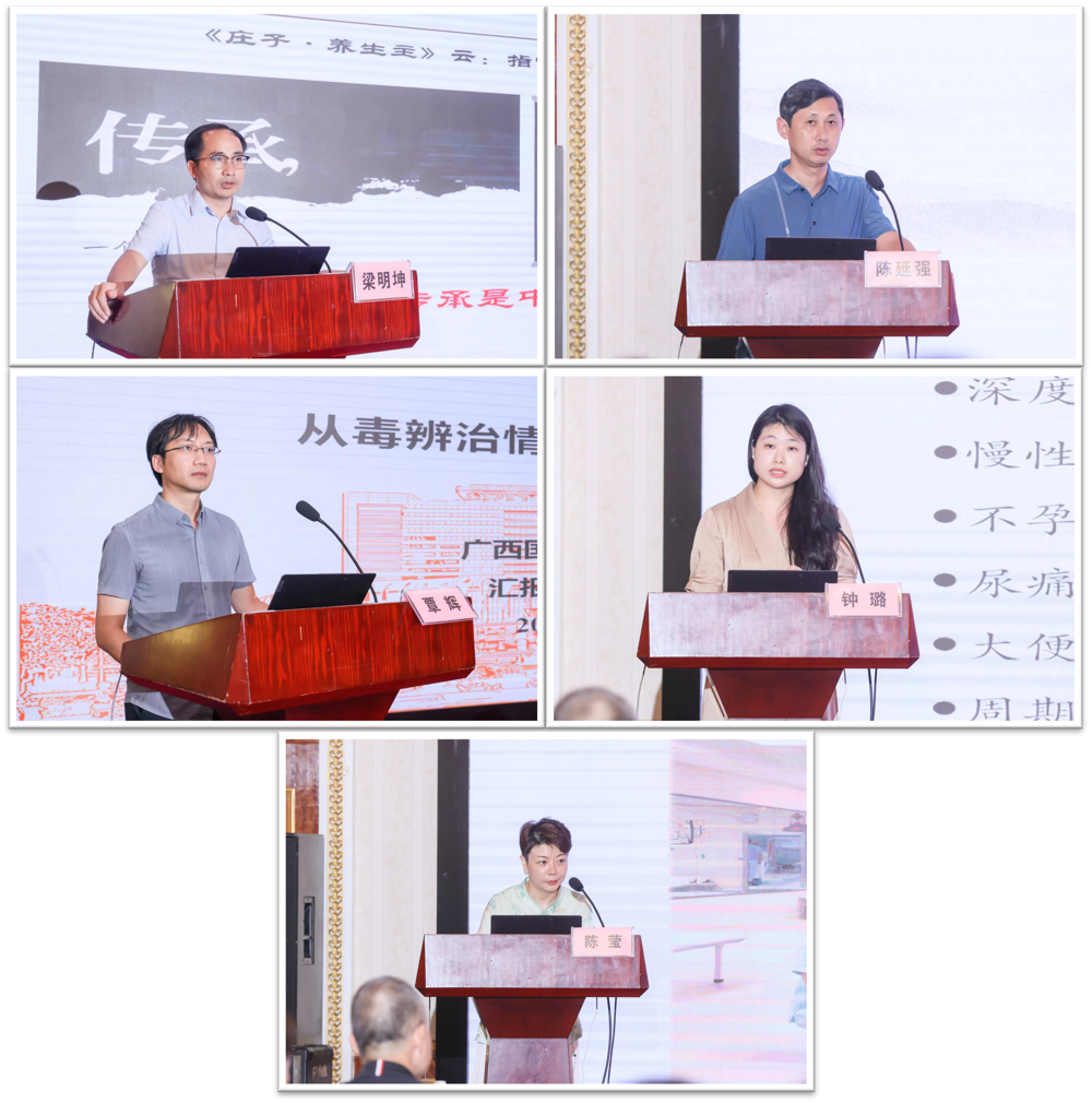 毒论毒病理论临床应用专题汇报环节,流派核心成员梁明坤博士、陈延强主任、覃辉博士、钟璐主任、陈莹副主任基于庞氏毒论及毒病治疗原则,分别就癌症、风湿病、情志病、妇科病及中风病的从毒辨治进行了深入阐述,展示了庞氏毒论在临床多领域的广泛应用与显著疗效。此专题汇报不仅为与会的医务人员提供了宝贵的治病经验与启示,也进一步推动了毒病理论和治疗原则在临床实践中的贯彻与应用。这些临床实践不仅丰富了毒病理论的应用范围,也证明了毒病毒论治疗原则在不同疾病治疗中的广泛适用性和有效性。