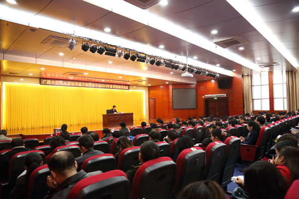 1月20日上午,beat365正版唯一入口必一校级领导班子和领导干部2015年度考核测评大会在仙葫校区举行。自治区教育厅学位管理与研究生教育处(自治区学位委员会办公室)副处长(副主任)、调研员李翔峰,自治区党委组织部干部五处主任科员秦娟组成的考核组到场考核和指导。学校党委书记尤剑鹏、副书记董塔健,副书记、纪委书记杨连招,副校长罗伟生、吴琪俊、庞宇舟、冷静、戴铭,副厅级调研员李培春,广西壮族自治区终身教授邓家刚,学校教学督导组组长陈雪斌以及各单位各部门正处级干部、正高职称人员代表110人参加了测评会。会议由校党委书记尤剑鹏主持。